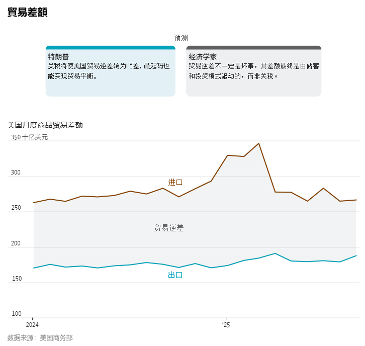 • 現象: 4 月份關稅生效前,企業搶運庫存導致逆差擴大;生效後逆差急劇下降。9 月逆差收窄至 790 億美元(五年新低),主要由黃金短期交易推動。