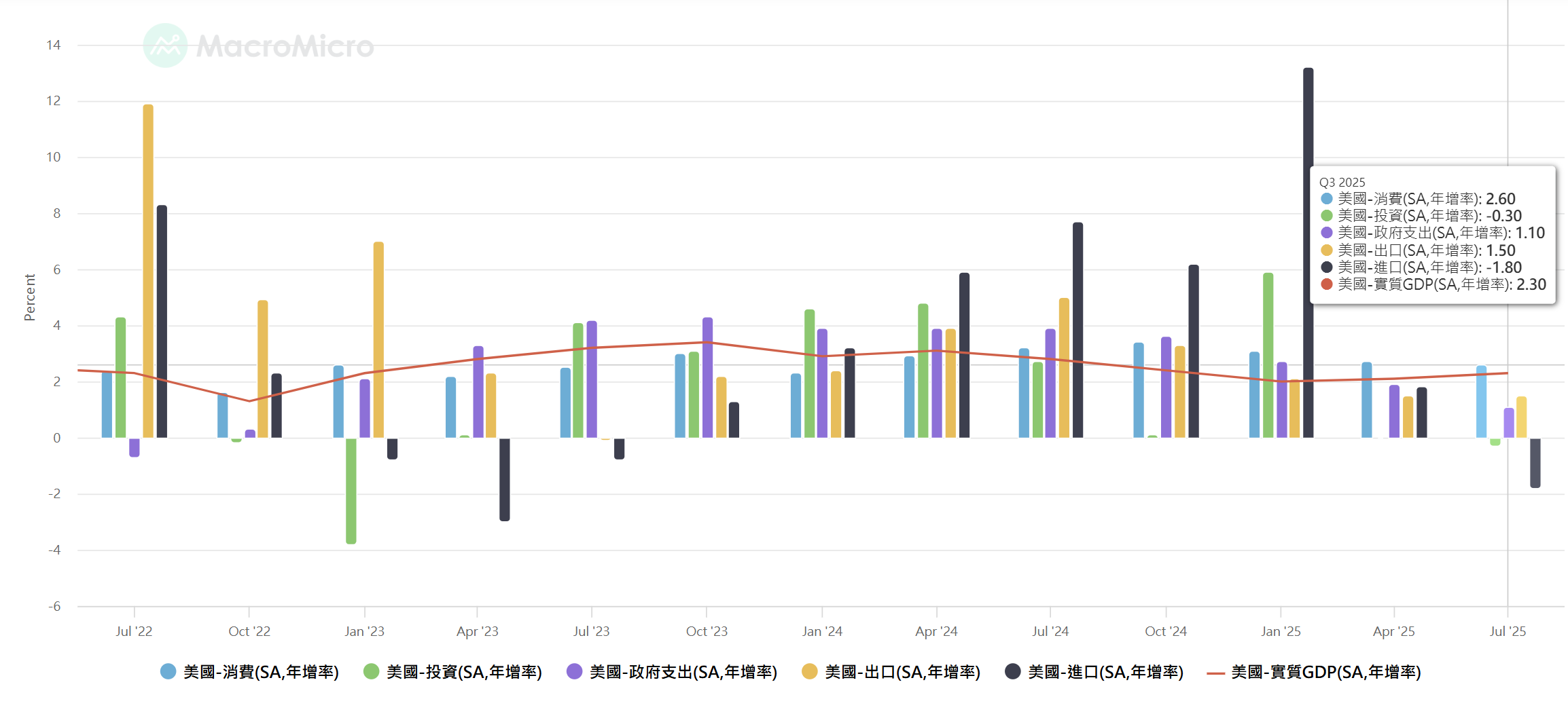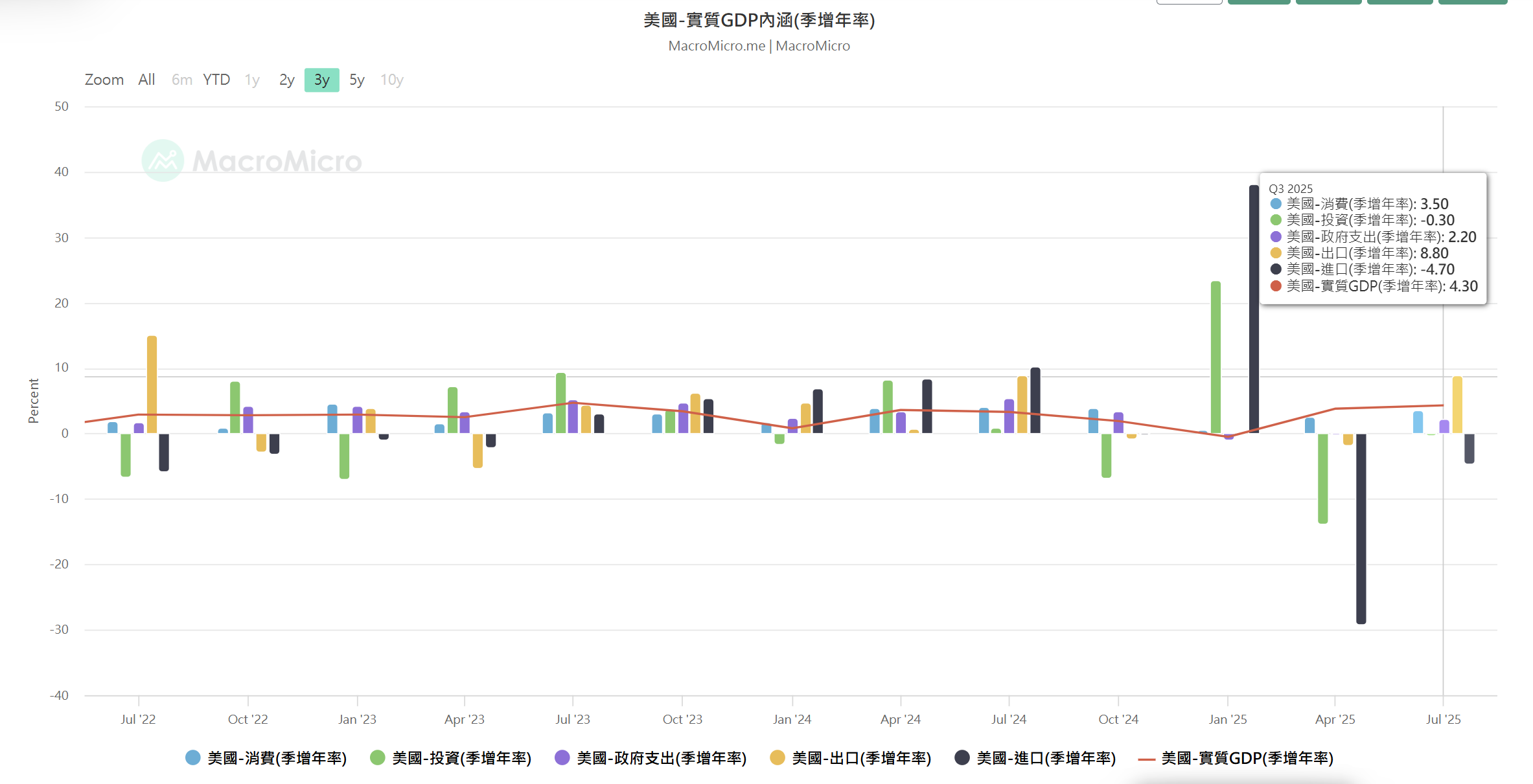 宏觀面(GDP): 看起來很美(4.3%),主要是因為關稅導致進口大減(數學遊戲)以及富人消費(服務業)支撐。