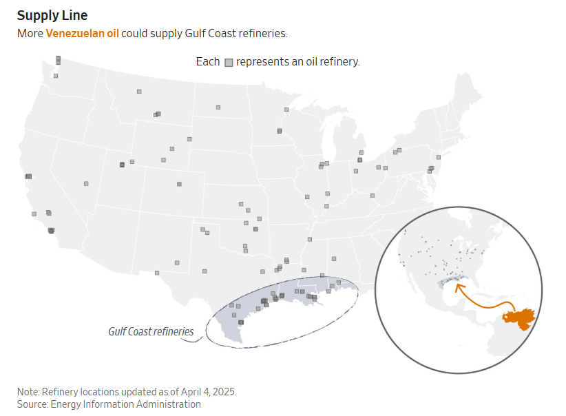 根據行業組織『美國燃料與石化製造商協會』(AFPM)的說法,約 70% 的美國煉油產能,在處理重質原油時的運行效率最高。」這些煉油廠集中在墨西哥灣沿岸,美國十大煉油廠中有九家位於該地區。近年來,委內瑞拉的石油產量大幅下降,其少量產量也多轉售給古巴和中國等國。