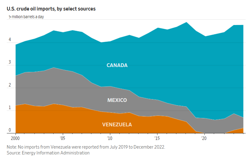 隨著墨西哥和委內瑞拉對美國的石油出口下降,煉油商轉而從加拿大進口石油。加拿大已大幅提高了其油砂重質原油的產量。如今,加拿大向美國煉油廠出口的石油量超過了所有其他國際供應商的總和。