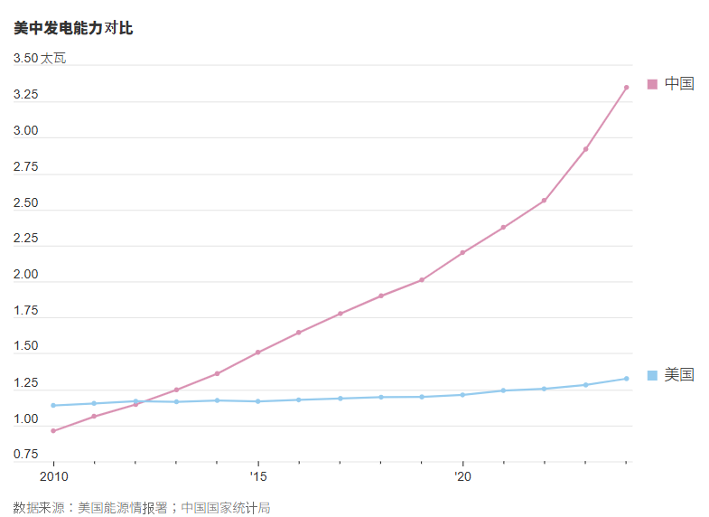 美國在 AI 軟體(模型)和硬體(晶片)上領先,但中國握有 「能源王牌」。