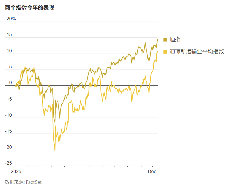 追蹤 20 家大型運輸公司的 道瓊運輸業平均指數 (DJT) 今年迄今上漲 10%,近期漲幅甚至超越那斯達克。這觸發了經典的 「道氏理論 (Dow Theory)」 牛市確認訊號。