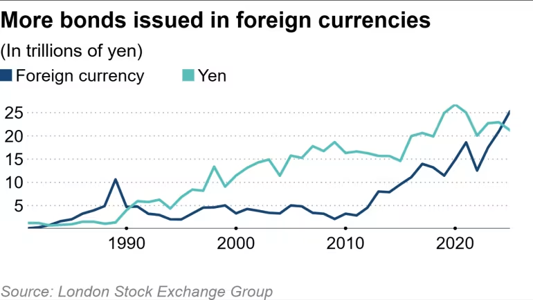 本報導指出,2025 年前 11 個月,日本企業發行了總額達 25 兆日圓(約 1,600 億美元) 的外幣債券,不僅打破年度紀錄,更預計將是 35 年來首次超過國內日圓債券發行量(21 兆日圓)。